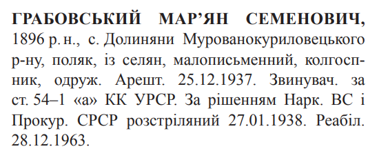 Мар'ян Грабовський розстріляний 27.01.1938.