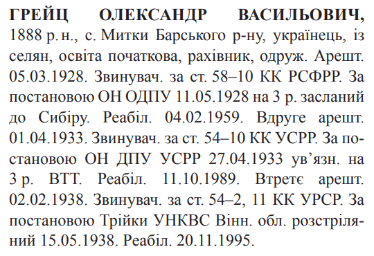 Олександр Грейц розстріляний 15.05.1938.