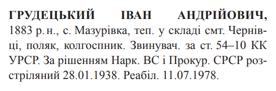 Соціальне походження: н/дОсвіта: н/дПартійність: н/дПрофесія (місце роботи): колгоспникСімейний стан: н/дЗаарештований: н/дЗвинувачення: ст. 54-10 КК УССРНаркомом ВС і Прокурором СССР засуджений до розстрілуДата вироку: 03.01.1938 (протокол № 694)Іван Грудецький розстріляний 28.01.1938 р. в м. Могилів-Подільський.Реабілітований: 11.07.1978