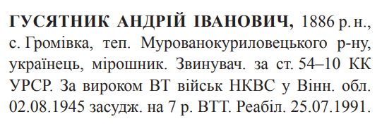 Соціальне походження: н/дОсвіта: н/дПартійність: н/дПрофесія (місце роботи): мірошникСімейний стан: н/дЗаарештований: н/дЗвинувачення: ст. 54-10 КК УССРВТ військ НКВД у Вінницькій обл. засуджений до 7 років ВТТДата вироку: 02.08.1945Реабілітований: Вінницькою облпрокуратурою 25.07.1991