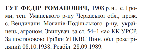 Федір Гут розстріляний 08.10.1938.
