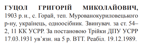 Соціальне походження: н/дОсвіта: н/дПартійність: н/дПрофесія (місце роботи): одноосiбникСімейний стан: н/дЗаарештований: 10.12.1930Звинувачення: ст. 54-2, 54-11 КК УССРТрійкою ГПУ УСРР засуджений до 5 років ВТТДата вироку: 17.03.1931Вібував покарання в таборі "Ухтпечлаг" НКВД СССР.Звільнений 25.12.1934 р.Реабілітований: Вінницькою облпрокуратурою 19.12.1989