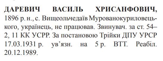 Соціальне походження: н/дОсвіта: н/дПартійність: н/дПрофесія (місце роботи): не працювавСімейний стан: н/дЗаарештований: 10.12.1930Звинувачення: ст. 54-2, 54-11 КК УССРТрійкою ГПУ УСРР засуджений до 5 років ВТТДата вироку: 17.03.1931Реабілітований: Вінницькою облпрокуратурою 20.12.1989 р.