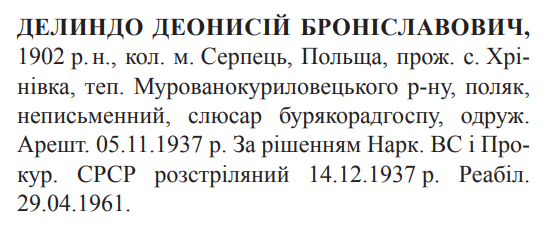 Деонисій Делиндо розстріляний 14.12.1937.