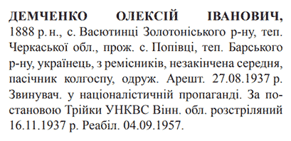 Олексій Демченко розстріляний 16.11.1937.