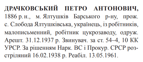 Соціальне походження: з робітниківОсвіта: малописьменнийПартійність: н/дПрофесія (місце роботи): робітник цукрозаводуСімейний стан: одруженийЗаарештований: 31.12.1937Звинувачення: ст. 54-4, 54-10 КК УССРНаркомом ВС і Прокурором СССР засуджений до розстрілуДата вироку: н/дПетро Драчковський розстріляний у Вінниці 17.02.1938 р.Реабілітований: 13.05.1961
