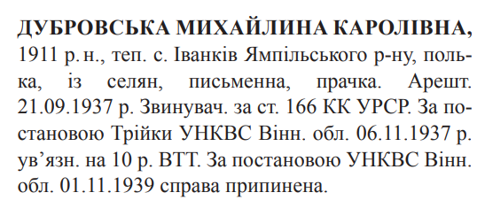 Реабілітована: За постановою УНКВД Вінн. обл. 01.11.1939 справа припинена Реабілітовані історією