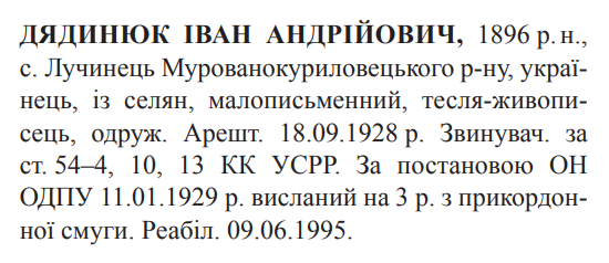 Кіровоградська область, Книга 5, стор. 306 Родина - брат Дядинюк Олександр Андрійович (1882 р.н.) - репрессований в 1928 р. - брат Дядинюк Володимир Андрійович (1898 р.н. ) - репресований у 1937 р. - брат Дядинюк Василь Андрійович (01.01.1900 - 21.01.1944) - поручник армії УНР, інтернований у таборі Каліш (Польща), український графік, майстер сакрального мистецтва, помер на еміграції. Архів ДАВіО, ф.Р-6023, оп.4, спр.12626.спр.П-9949