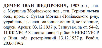 Іван Дячук розстріляний 13.12.1937 р. у м. Вінниця.