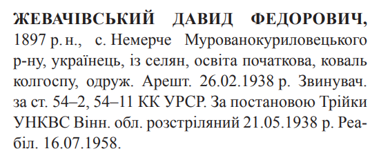 Давид Жевачівський розстріляний 21.05.1938.