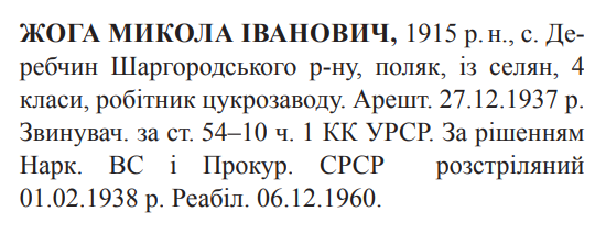 Микола Жога розстріляний 01.02.1938.