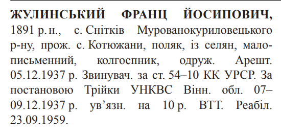 Реабілітований: Вінницьким облсудом 23.09.1959 Реабілітовані історією