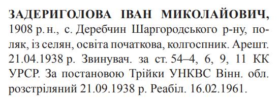 Іван Задериголова розстріляний 21.09.1938.