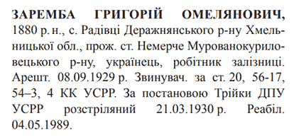 Григорій Заремба розстріляний 21.03.1930.