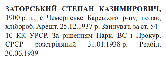 Соціальне походження: н/дОсвіта: н/дПартійність: н/дПрофесія (місце роботи): хліборобСімейний стан: н/дЗаарештований: 25.12.1937Звинувачення: ст. 54-10 КК УССРНаркомом ВС і Прокурором СССР засуджений до розстрілуДата вироку: 16.01.1938Степан Заторський розстріляний в м. Вінниця 01.02.1938 р.Реабілітований: Вінницькою облпрокуратурою 30.06.1989 р.