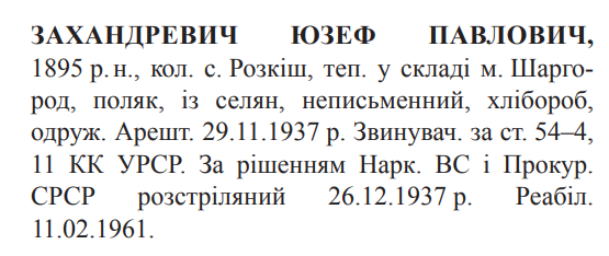 Юзеф Захандревич розстріляний 26.12.1937.
