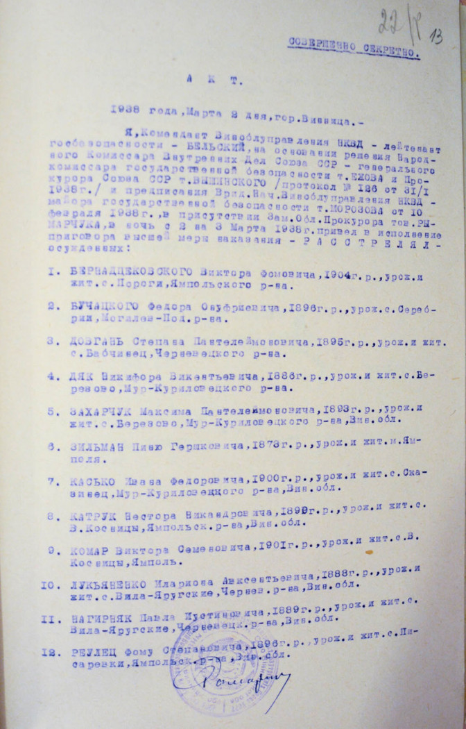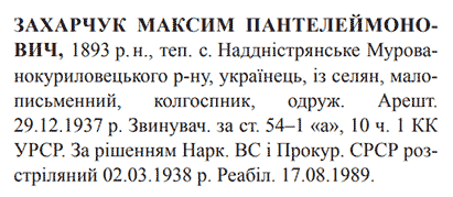 Соціальне походження: із селянОсвіта: малописьменнийПартійність: н/дПрофесія (місце роботи): колгоспникСімейний стан: одруженийЗаарештований: 29.12.1937Звинувачення: ст. 54-1 "а", 54-10 ч.1 КК УССРНаркомом ВС і Прокурором СССР засуджений до розстрілуДата вироку: 31.01.1938Максим Захарчук розстріляний 03.03.1938 р. в м. Вінниця Реабілітований: Вінницьким облпрокурором 17.08.1989