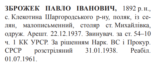 Соціальне походження: із селянОсвіта: малописьменнийПартійність: н/дПрофесія (місце роботи): столяр ст. МихайлівкаСімейний стан: одруженийЗаарештований: 22.12.1937Звинувачення: ст. 54-10 ч.1 КК УССРНаркомом ВС і Прокурором СССР засуджений до розстрілуДата вироку: н/дПавло Зброжек розстріляний в м. Вінниця 01.02.1938 р.Реабілітований: 01.07.1961 р.