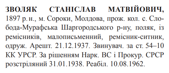 Соціальне походження: з ремісниківОсвіта: малописьменнийПартійність: н/дПрофесія (місце роботи): ремісник-ситникСімейний стан: одруженийЗаарештований: 21.12.1937Звинувачення: ст. 54-10 КК УССРНаркомом ВС і Прокурором СССР засуджений до розстрілуДата вироку: 16.01.1938Станіслав Зволяк розстріляний 01.02.1938 р. в м. ВінницяРеабілітований: Верховним судом УССР 10.08.1962 р.
