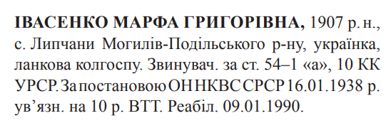 Реабілітована: Вінницькою облпрокуратурою 09.01.1990 Реабілітовані історією