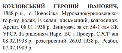 Соціальне походження: із селянОсвіта: письменнийПартійність: н/дПрофесія (місце роботи): колгоспникСімейний стан: н/дЗаарештований: 08.01.1938Звинувачення: ст. 54-1 "а" КК УССРНаркомом ВС і Прокурором СССР засуджений до розстрілуДата вироку: 08.02.1938Героній Козловський розстріляний 27.03.1938 в м. Вінниця.Реабілітований: Вінницькою облпрокуратурою 07.07.1989