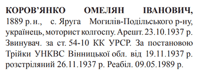 Омелян Коров'янко розстріляний 26.11.1937 р.