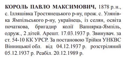 Павло Король розстріляний 05.12.1937.