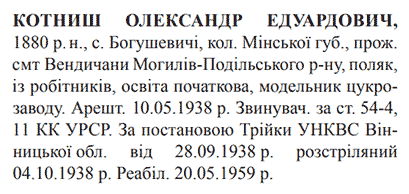 Олександр Котниш розстріляний 04.10.1938.