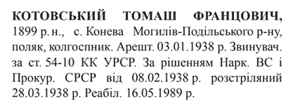 Соціальне походження: н/дОсвіта: н/дПартійність: н/дПрофесія (місце роботи): колгоспникСімейний стан: н/дЗаарештований: 03.01.1938Звинувачення: ст. 54-10 КК УССРНаркомом ВС і Прокурором СССР засуджений до розстрілуДата вироку: 08.02.1938Томаш Котовський розстріляний у Вінниці 29.03.1938 р.Реабілітований: 16.05.1989