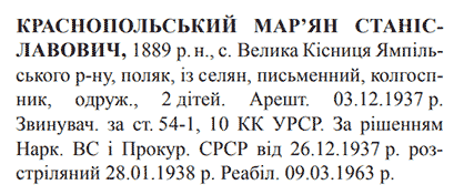 Соціальне походження: із селянОсвіта: письменнийПартійність: н/дПрофесія (місце роботи): колгоспникСімейний стан: одружений, двоє дітейЗаарештований: 03.12.1937Звинувачення: ст. 54-1, 54-10 КК УССРНаркомом ВС і Прокурором СССР засуджений до розстрілуДата вироку: 26.12.1937Мар'ян Краснопольський розстріляний 28.01.1938 р. в м. Могилів-Подільський.Реабілітований: 09.03.1963
