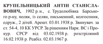 Соціальне походження: із селянОсвіта: письменнийПартійність: н/дПрофесія (місце роботи): колгоспникСімейний стан: одружений, двоє дітейЗаарештований: 03.01.1938Звинувачення: ст. 54-4, 10 КК УССРНаркомом ВС і Прокурором СССР засуджений до розстрілуДата вироку: 03.02.1938Антін Крупельницький розстріляний у Вінниці 17.02.1938 р. Реабілітований: 02.03.1967