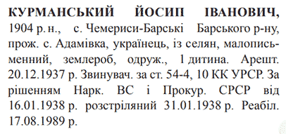 Соціальне походження: із селянОсвіта: малописьменнийПартійність: н/дПрофесія (місце роботи): землеробСімейний стан: одружений, одна дитинаЗаарештований: 20.12.1937Звинувачення: ст. 54-4, 10 КК УССРНаркомом ВС і Прокурором СССР засуджений до розстрілуДата вироку: 16.01.1938Йосип Курманський розстріляний 01.02.1938 р. в м. Вінниця Реабілітований: 17.08.1989 р.