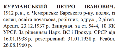 Соціальне походження: із селянОсвіта: початковаПартійність: н/дПрофесія (місце роботи): робітникСімейний стан: одружений, двоє дітейЗаарештований: 23.12.1937Звинувачення: ст. 54-4, 10 КК УССРНаркомом ВС і Прокурором СССР засуджений до розстрілуДата вироку: 16.01.1938Петро Курманський розстріляний 01.02.1938 р. в м. ВінницяРеабілітований: 26.08.1960 р.