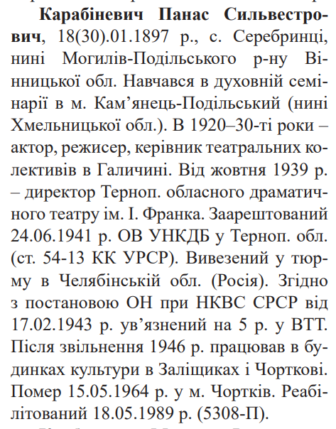 1913-1915 - навчання в Подільській духовній семінарії (нині м. Кам'янець-Подільський Хмельницької обл.).1915-1916 - воював у російській імператорській армії. Після тяжкого поранення демобілізований. Від 1917 - в театрі Миколи Садовського, з яким весною 1919 перебував в межах ЗУНР, на Тернопільщині.Залишився на Галичині у зоні окупації Польщі, прийняв польське громадянство, актор мандрівної театральної трупи.1932-1939 очолював кооперативний театр у Тернополі, який щороку гастролював по українських воєводствах Речі Посполитої.Від 1939 - в зоні російської окупації. Директор Тернопільського обласного театру імені Івана Франка.24.06.1941 - заарештований ОВ УНКГБ у Тернопільській обл. (ст. 54-13 КК УССР).Вивезений до тюрми в Челябінській обл. (нині Росія).17.02.1943 - Особливою нарадою при НКВД СССР засуджений до 5 років ВТТ.Звільнений 1946, але повністю не реабілітований. Працював методистом Тернопільського обласного будинку народної творчості, режисером Заліщицького і Чортківського самодіяльних театрів, 1951-1961 - диригентом Чортківського районного будинку культури, де поставив кілька вистав. Панас Карабіневич помер 15 травня 1964 р.Похований у м. Чортків, Тернопільська обл.