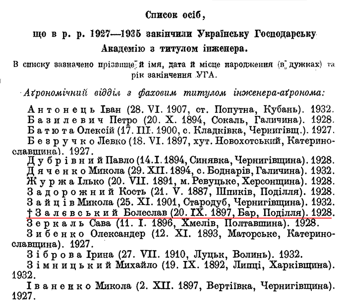 що в р.р. 1927-1935 закінчили Українську Господарську Академію з титулом інженера