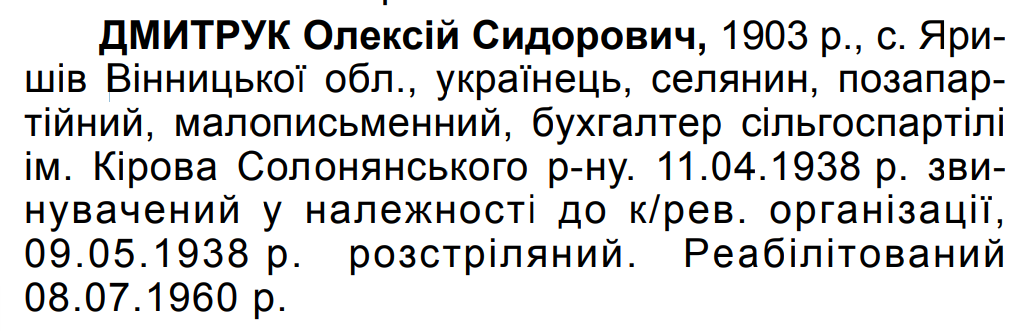 Олексій Дмитрук розстріляний 09.05.1938 р.
