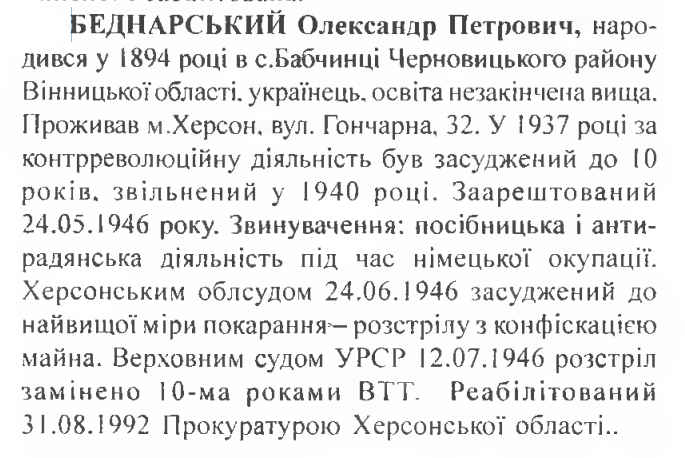 Реабілітований: прокуратурою Херсонської обл. 31.08.1992 р. Реабілітовані історією