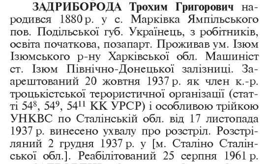 Трохим Задриборода розстріляний 02.12.1937 р. у м. Сталіно (Донецьк).