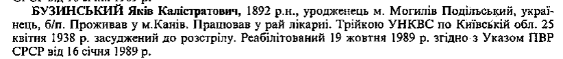 Яків Бузинський розстріляний 15.05.1938 р. у м. Київ.