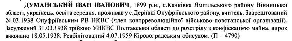 Іван Думанський розстріляний 18.05.1938 р.