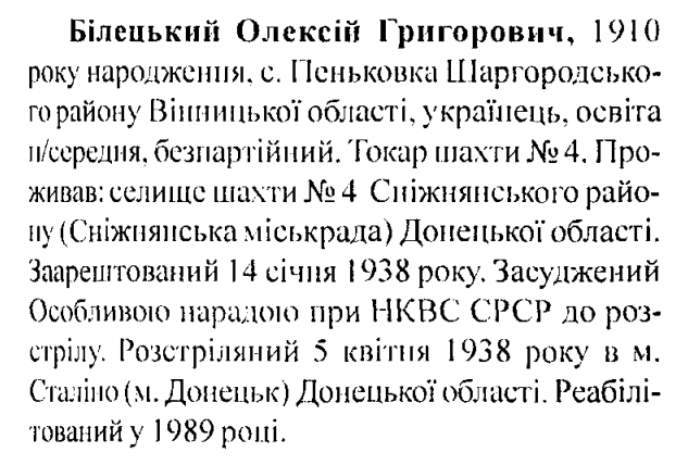 Олексій Білецький розстріляний 05.04.1938 р. у м. Сталіно (Донецьк)