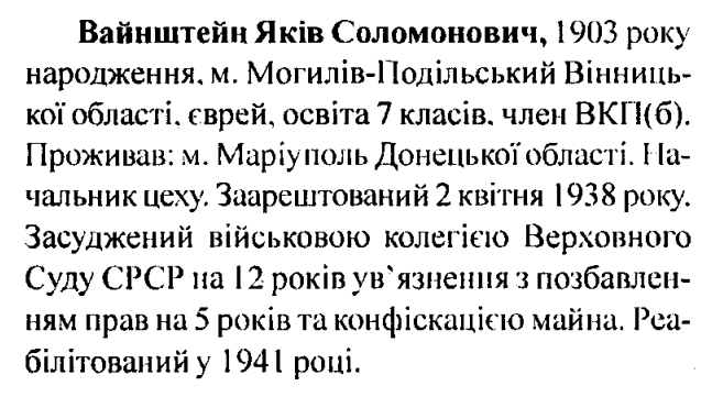 Соціальне походження: н/дОсвіта: 7 кл.Партійність: член ВКП(б)Професія (місце роботи): начальник цехуСімейний стан: н/дЗаарештований: 02.04.1938Звинувачення: н/дВК Верховного Суду СССР засуджений до 12 років ВТТ з конфіскацією майна і 5 років п/пДата вироку: н/дРеабілітований: н/д