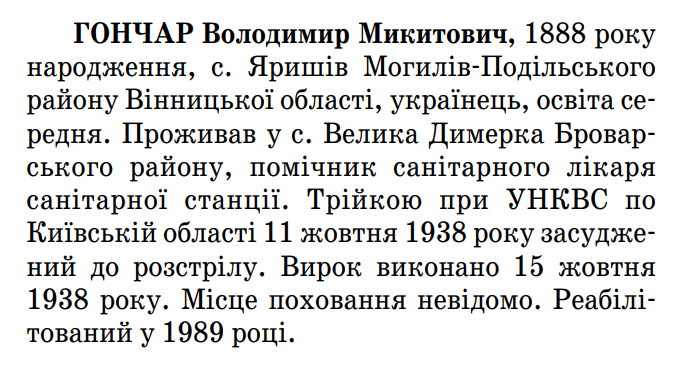 Володимир Гончар розстріляний 15.10.1938 р. у м. Київ
