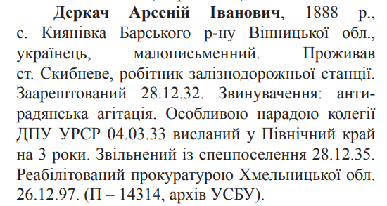 Соціальне походження: н/дОсвіта: малописьменнийПартійність: н/дПрофесія (місце роботи): робітник залізничної станціїСімейний стан: н/дЗаарештований: 28.12.1932Звинувачення: "антирадянська агітація"ОН ГПУ засуджений до 3 років вислання до Північного краюДата вироку: 04.03.1933Звільнений із спецпоселення 28.12.1935 р.Реабілітований: прокуратурою Хмельницької обл. 26.12.1997 р.