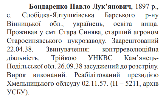 Соціальне походження: н/дОсвіта: вищаПартійність: н/дПрофесія (місце роботи): старший агроном Старосинявського цукрозаводуСімейний стан: н/дЗаарештований: 22.04.1938Звинувачення: "контрреволюційна діяльність"Трійкою УНКВД по Кам'янець-Подільській обл. засуджений до розстрілуДата вироку: 26.09.1938Дата розстрілу і місце поховання невідомі.Реабілітований: президією Хмельницького облсуду 02.11.1957 р.