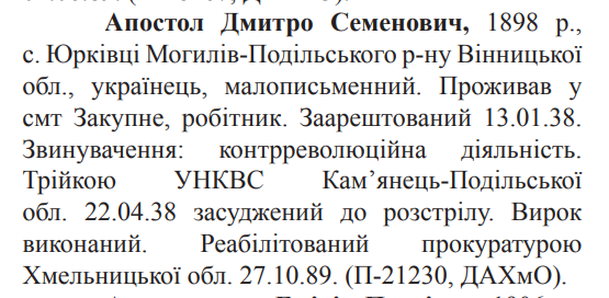 Соціальне походження: н/дОсвіта: малописьменнийПартійність: н/дПрофесія (місце роботи): робітникСімейний стан: н/дЗаарештований: 13.01.1938Звинувачення: "контрреволюційна діяльність"Трійкою УНКВД по Кам'янець-Подільській обл. засуджений до розстрілуДата вироку: 22.04.1938Дата розстрілу і місце поховання невідомі.Реабілітований: прокуратурою Хмельницької обл. 27.10.1989 р.
