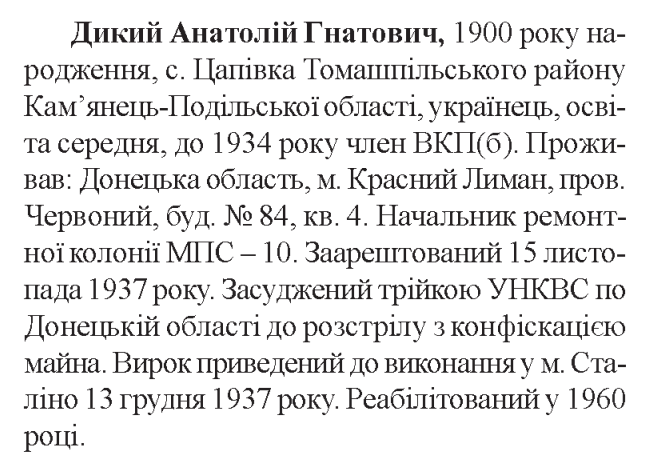 Анатолій Дикий розстріляний 13.12.1937 р. у м. Сталіно (Донецьк)