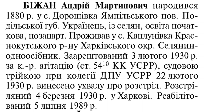 Андрій Біжан розстріляний 04.03.1930 р. у м. Харків