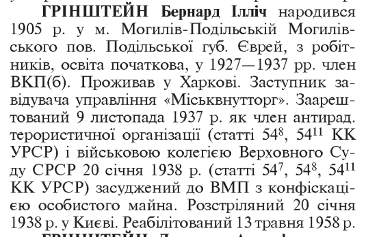 Бернард Грінштейн розстріляний 20.01.1938 р. у м. Київ.