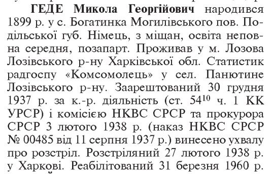 Микола Геде розстріляний 27.02.1938 р. у м. Харків